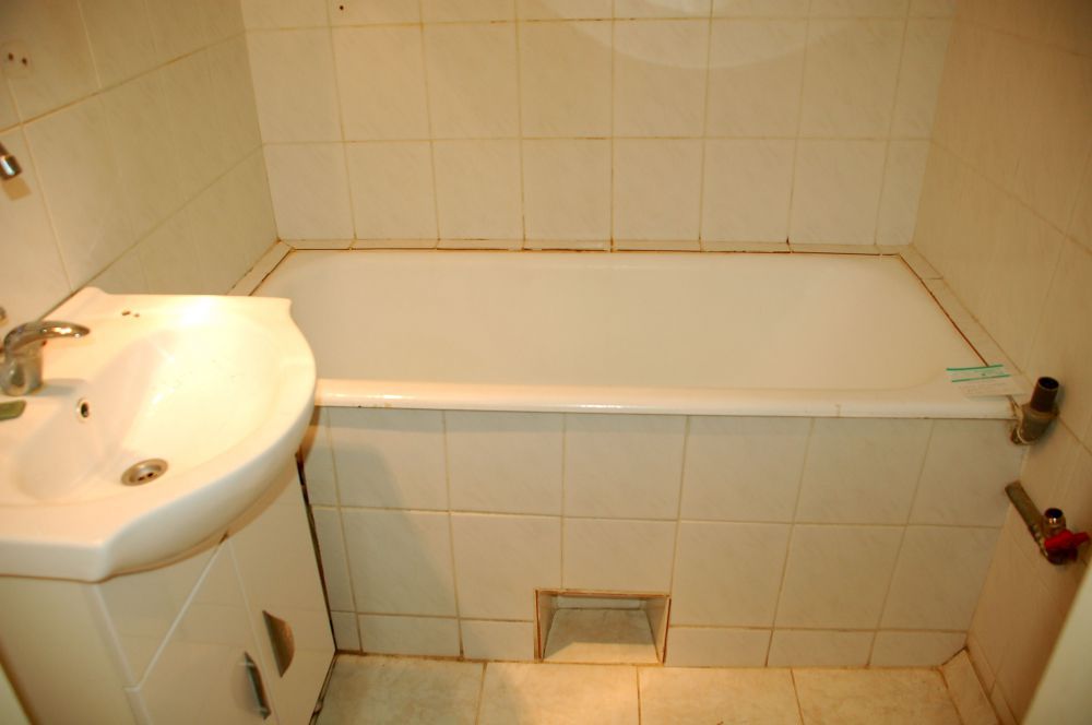 Ez volt a régi fürdőszoba, ezt kellet teljes mértékben átalakítanunk. Terv szerint a kád helyére épített zuhanyfülkét készítünk, illetve a mosdós szekrény helyett mosdópultot építünk.