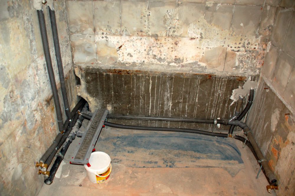 Ha elvégeztük a leszerelvényezést és az összes bontást, villanyszerelést, akkor következhet a vízszerelési fázis. Ez a munkamenet tartalmazhatja a régi csövek szelepek cseréjét, illetve az új kiállások építését is. Mi esetünkben kád helyett zuhanyfülke építés lesz folyókával és esőztetővel, amihez kialakítjuk az új vízcső és lefolyórendszert. Ehhez a rendszerhez csatlakoztatjuk a mosógép csöveit is, majd következik a mosdópulthoz való új sarokszelepek és csövek kiépítése.