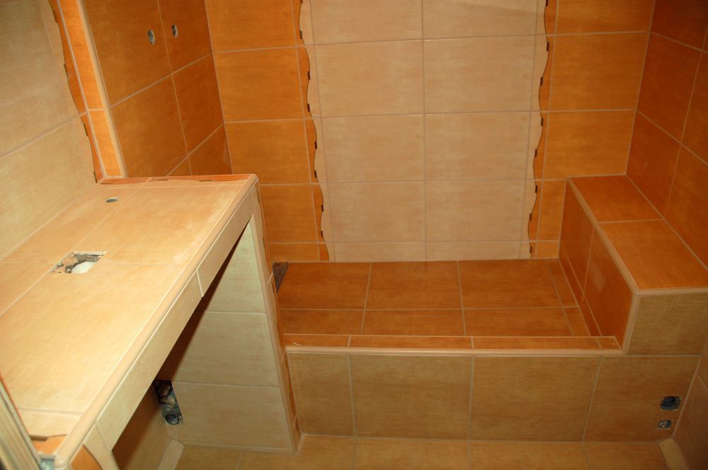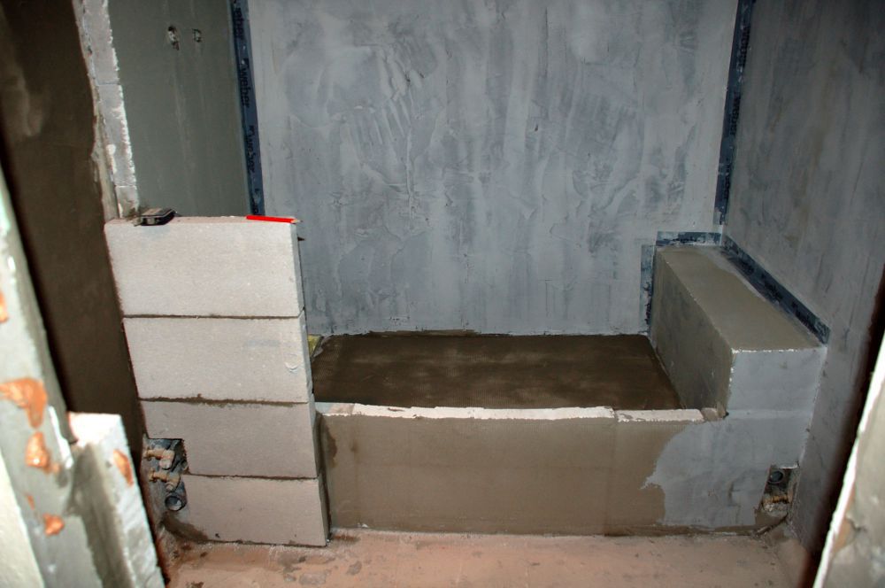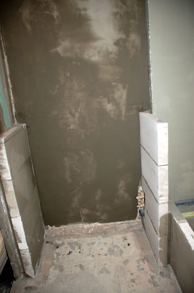 Mikor végeztünk a vízszereléssel, akkor kezdhetjük a burkolandó felületek síkba hozását azaz a kiegyenlítést (falkiegyenlítés és aljzatkiegyenlítés). De ezen fázisokat csak jól lealapozott felületeken végezhetjük, mert ha poros marad a kiegyenlítendő felület, akkor a ragasztó vagy a padlopon megrepedhet és elválhat. A falak kiegyenlítését gletteléssel, az aljzatok kiegyenlítését pedig padloponozással készítjük. Ezek után nekiállhatunk a zuhanykabin építésének. Ez a munkafázis tartalmazza a vízcsövek takarását falazással, a zuhyany aljzat betonozását, és a kifolyásgátló küszöb építését ytong téglából. Ha a falazott, betonozott, glettelt és padloponozott felület kiszáradt, utána kezdhetünk neki a vízszigetelésnek. Elsőként a hajlaterősítő szalagot építjük be a negatív sarkokba, majd ezután következhet a folyékony fólia felhordása, amit kétszer kell elvégeznünk a megfelelő eredmény elérése végett.